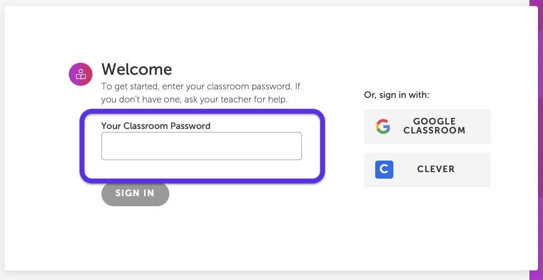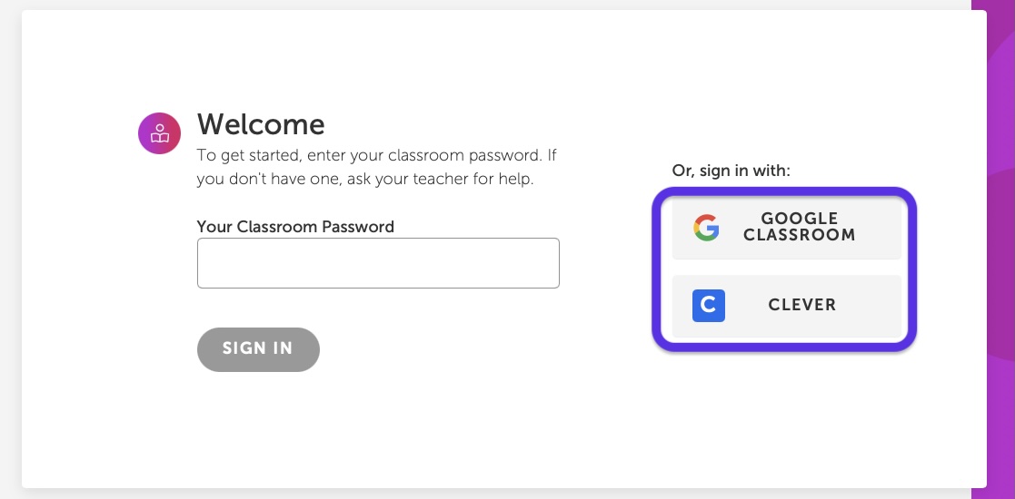 If you’ve connected your Google Classroom or Clever account with Scholastic, you can also click the Google Classroom or Clever buttons to sign in that way. (Click here to learn more about connecting your account with Learning Management Systems.)